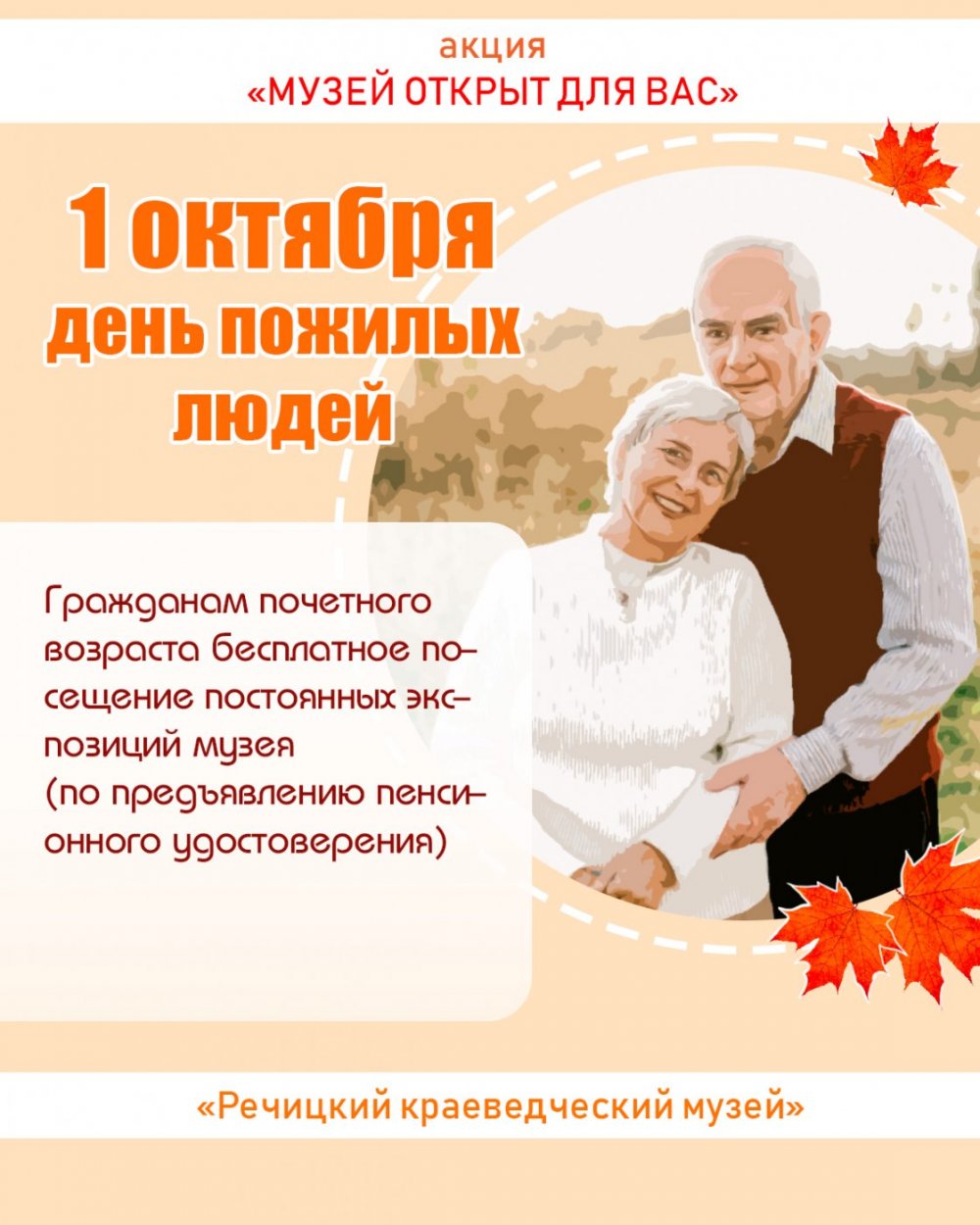 Акция ко Дню пожилых людей «Музей открыт для Вас!» бесплатное посещение постоянно действующих экспозиций (экскурсионное сопровождение по Прейскуранту цен)