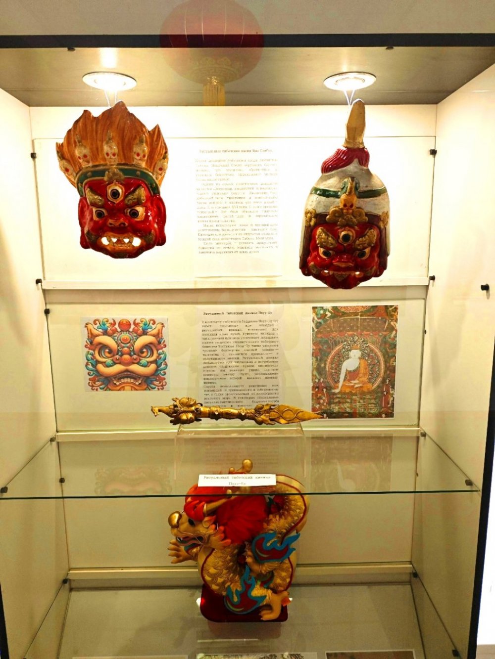 Кроме завораживающих мастерством исполнения картин, на выставке «Страна драконов» представлены: традиционные китайские «узлы», фарфор, изделия из камня, шёлк, а также тибетские ритуальные маски и кинжал Пхурбу.
