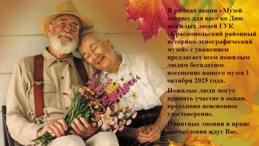 Акция «Музей открыт для вас» ко Дню пожилых людей. ГУК «Краснопольский районный историко-этнографический музей» с уважением предлагает всем пожилым людям бесплатное посещение нашего музея 1 октября 2025 года.